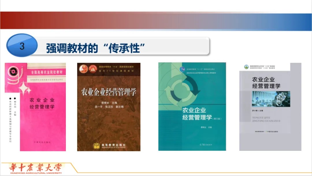 (3)拓展时期:本世纪初以来,是本课程继承发展、尝试创新和体现时代特色的拓展阶段。随着各种形式的现代化农业企业的丰富实践,如农业产业化经营、农业工厂化经营、农业科技园区企业化经营等的不断涌现,给农业企业经营管理学课程建设提出了新的要求。为顺应这一要求,蔡根女教授主编了普通高等教育“十一五”国家级规划教材、面向21世纪课程教材《农业企业经营管理学(第二版)》《农业企业经营管理学(第三版)》。在此基础上,在张俊飚教授主持建设了《农业企业经营管理学》省级精品课程,课程得到了进一步发展。2019年,经过一年多的建设,课程在中国大学MOOC上线。2021年,为了与时俱进和满足广大师生的最新需求,罗小锋教授带领编写组再次对教材进行修订,教材入选普通高等教育农业农村部“十四五”规划教材。2023年,罗小锋教授主持建设的《农业企业经营管理学》入选国家级线下一流课程。