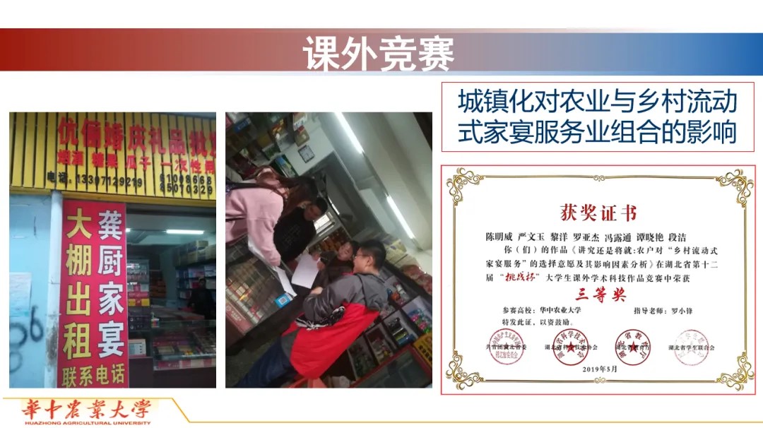 课程团队成员何可老师主讲《农业资源与环境经济学》《农业企业经营管理学》《经济学研究方法》《科研案例分析》等本科生课程,《人口经济学》《现代农业创新与乡村振兴战略》等研究生课程。获全国农业专业学位研究生实践教学成果二等奖、全国大学生能源经济学术创意大赛优秀指导老师奖、365英国上市公司教书育人贡献奖等。所指导学生获评“湖北省乡村振兴青年先锋”、中国国际“互联网+”大学生创新创业大赛湖北省金奖、周诚农业经济学家二等奖。先后主持国家社科基金、国家自科基金及省部级课题10余项。以独立、第一或通讯作者身份在《Science》(Letter)、《管理世界》《经济学(季刊)》,以及国务院官网、《光明日报》《经济日报》等发表文章60余篇。