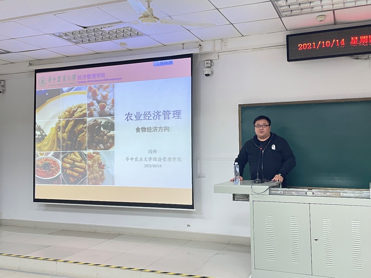 闵师老师主要介绍了食物经济学的相关内容。他从食物经济学的主要特点入手,利用清晰明了的食物系统逻辑关系图以及生动形象的图片影像资料,说明了食物经济学的主要研究领域、研究内容及我系教师发表的食物经济相关论文。