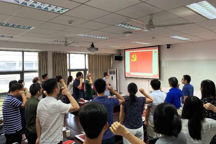 会议伊始,颜廷武同志说明了此次活动的宗旨和目的,并由张安然同志介绍了活动的具体流程和内容。在活动第一部分“不忘初心、牢记使命”环节,全体党员在颜廷武同志和张晓恒同志的带领下,重温入党誓词。第二部分为“回眸辉煌历史”,全体党员一同观看了“中华人民共和国中央人民政府成立典礼”及“毛泽东在中国人民政治协商会议第一届全体会议上致开幕词”的原始影像资料,聆听伟人的声音,感受新中国成立激动人心的时刻,支部党员围绕新中国成立70周年自由发言,畅谈感想和体会。作为一位有着35年党龄的老党员,郑炎成同志讲述了自己所见证的祖国几十年来翻天覆地的变化,并嘱托当代大学生要珍惜当今美好生活,有所作为;张俊飚同志分享了自己早期在中国台湾地区和英国等国家的切身经历,并结合我国从建国初期、改革开放到如今所实施的一系列政策措施,赞叹我国当前社会变化之快,发展之好;盖豪同志认为作为博士生要不忘初心,搞好科研,为祖国贡献自己的力量;刘大鹏同志谈到,自己在华农八年的日子里深切目睹了学校的变化,作为一名学生应牢记使命,希望学校发展更好。活动第三部分为“总结伟大成就”——“我和我的祖国”主题有奖知识竞赛。活动通过知识竞赛的方式,一改以往单一的理论学习形式,不仅使党员同志们学习了党史、新中国史、校史,还总结回顾了新中国成立以来我国在农业、工业、军事、科技、体育等方面取得的突出成就,同时题目也涉及到了习近平总书记给我校本禹志愿服务队回信、习近平总书记给全国涉农高校的书记校长和专家代表的回信等重要指示精神。现场师生混编分为三组,题型包括必答题和抢答题,三组答题积极,竞争激烈,现场气氛热烈。第四部分为“畅想美好未来”,老党员代表发言,寄语新党员。曹明宏同志讲述了新中国的巨大变化,并表达了对博士生新党员同志们学习科学文化知识,报效国家的殷切希望;凌远云同志着重指出了坚持党的领导的重要性,并告诫在场的博士生党员同志们在做科研的同时要重视理论知识学习的重要性,同时鼓励大家在科研的同时要加强锻炼身体。