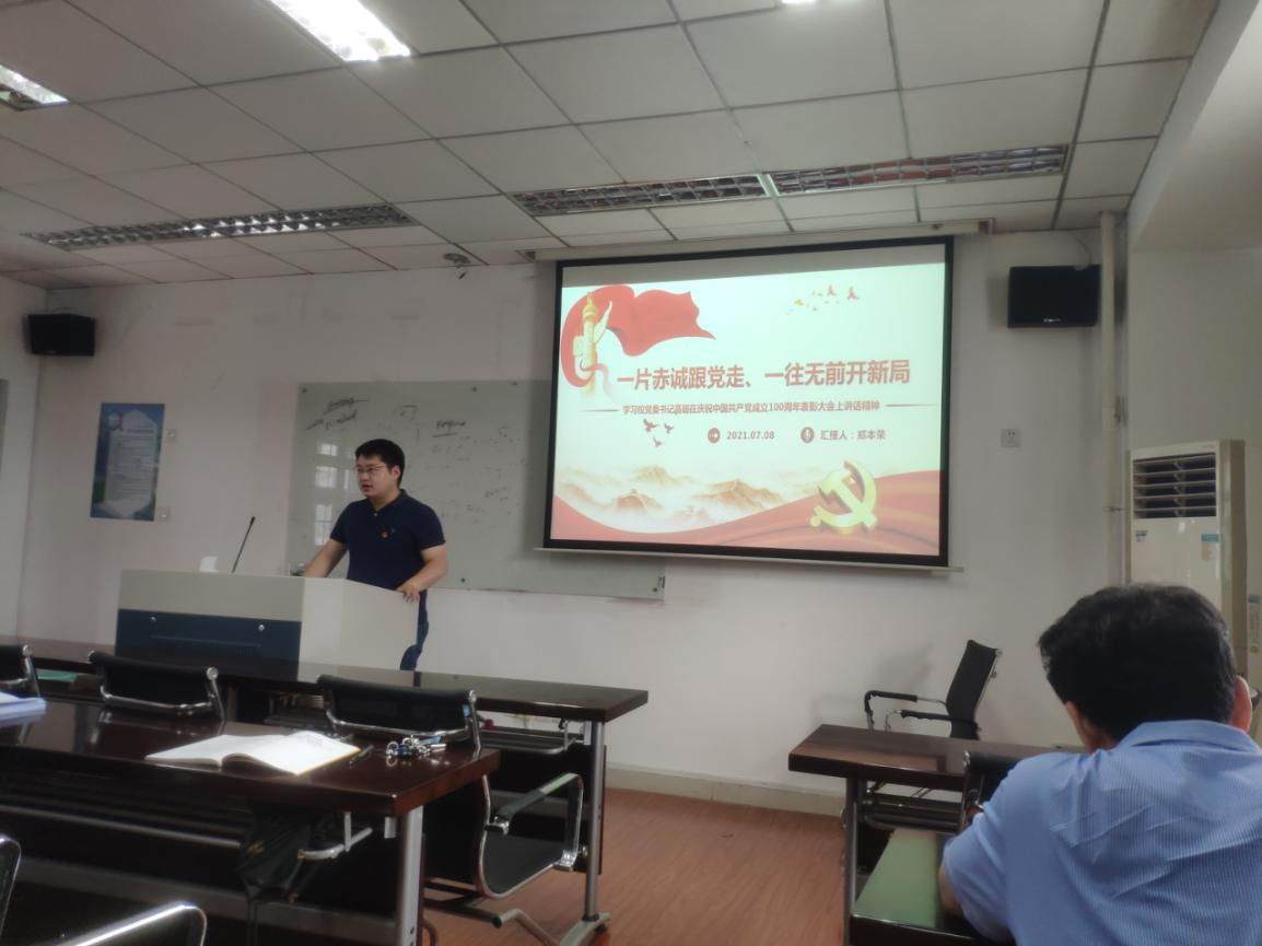 紧接着,郑本荣老师传达了学校庆祝中国共产党成立100周年表彰大会的精神。他着重分享了高翅书记对全校党员“争当先锋”的四点要求:学思践悟当先锋;立德树人当先锋;在党兴党当先锋;自立自强当先锋。在谈及学习心得和感悟时,他认为作为一名青年教师,要始终保持党员的先锋模范作用,在自己的工作岗位上勤勤恳恳、踏实工作,为国家培养有用之才。他还号召大家主动践行高书记提出的先锋要求,在日常教学中不断提高立德树人的能力,为学生全面发展保驾护航;与华农同心同向同行,将“宏你学、扬国光”的价值追求内化于心、外施于行;为华农建设特色鲜明的世界一流大学奉献自己的力量。