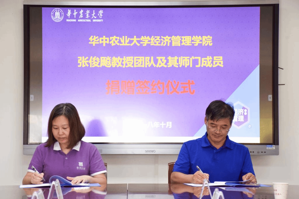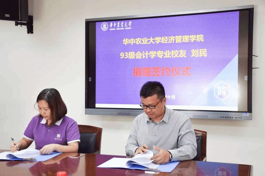 仪式之初,张越书记对各位校友的到来表示热烈欢迎,并感谢校友对学院学科建设的大力支持。随后,张俊飚教授团队及其师门成员捐赠122018元,93级会计学专业校友刘民代表专业捐赠60万元,副院长申沛代表学院和捐赠校友代表签署了捐赠协议。