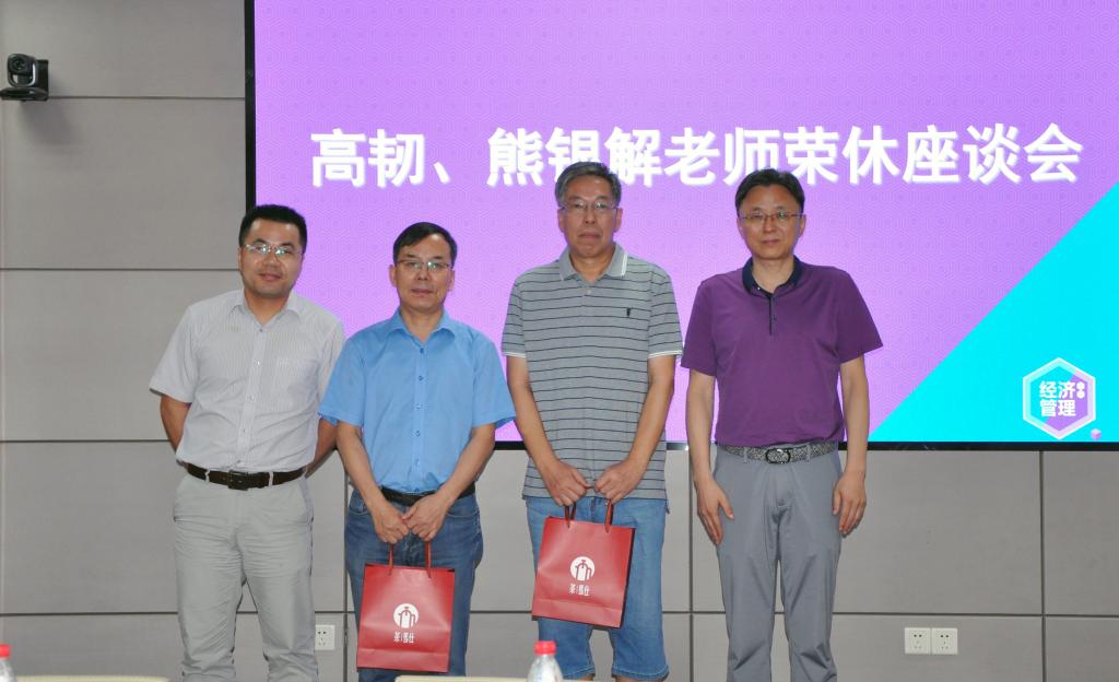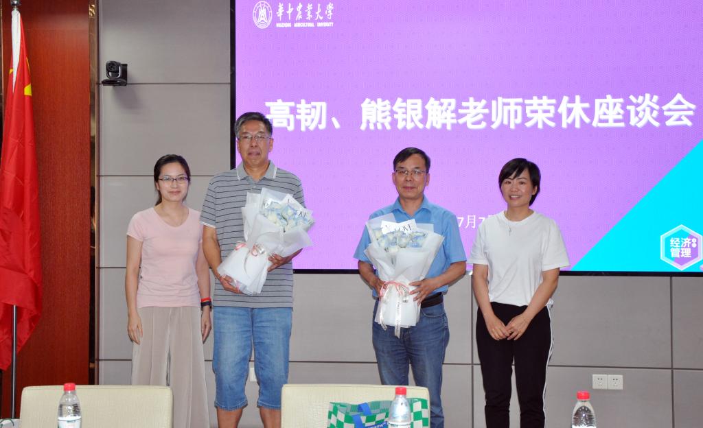 7月7日下午,市场营销系在人文楼412会议室举办高韧、熊银解老师荣休座谈会,学院党委书记陈国顺,院长李谷成,副书记刘三宝,副院长于久霞、罗小锋、颜廷武、项朝阳以及学院教师代表和市场营销系全体教师参加座谈会。会议由市场营销系主任包玉泽主持。