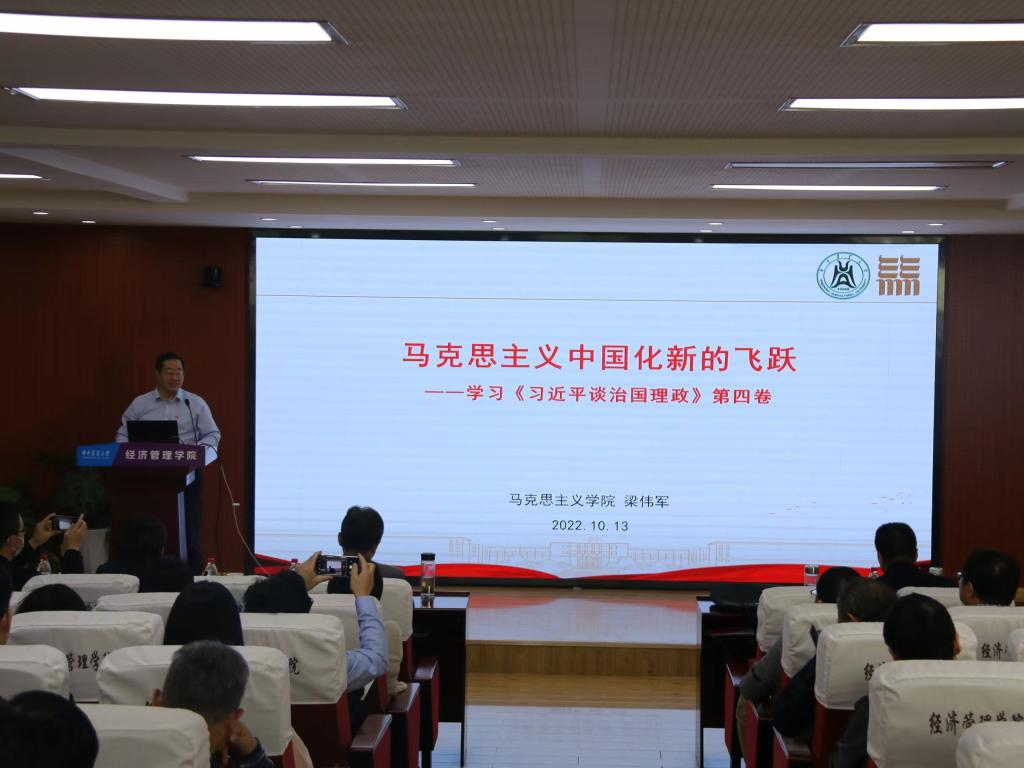 为了深入学习领会《习近平谈治国理政》第四卷,进一步加强思想理论武装,10月13日下午,我校马克思主义学院梁伟军教授应邀做了“马克思主义中国化新的飞跃——学习《习近平谈治国理政》第四卷”精读精讲专题辅导报告。全院教职工参会学习。报告会由院党委书记陈国顺主持。