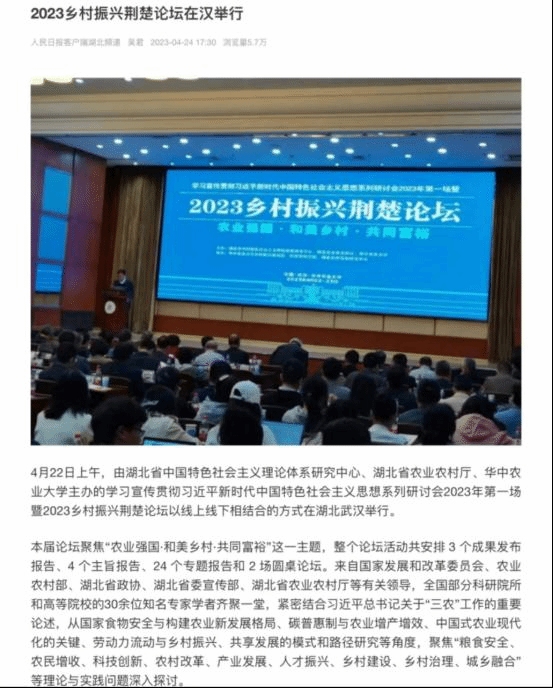 核心提示:2023年4月22日至23日,2023乡村振兴荆楚论坛在我校举办。论坛举办以来,人民日报、经济日报、农民日报、湖北日报、湖北卫视等多家权威媒体的宣传报道,引发了各界的热烈讨论。