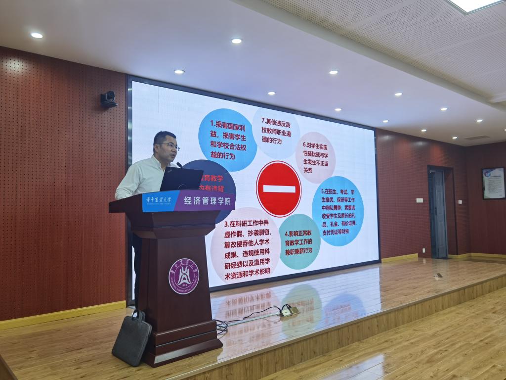 学院院长李谷成以“以德立身 以德立学 以德施教 以德育德”为主题,从习近平总书记关于师德师风的重要论述、高校教师师德要求、高校教师师德失范案例、在立德树人过程中如何做等四个方面作师德师风专题报告。他带领教职工重温了《关于建立健全高校师德建设长效机制的意见》中明确的师德禁行行为“红七条”以及《新时代高校教师职业行为十项准则》《研究生导师指导行为准则》等师德规范,通报了2022年8月以来教育部公开曝光的21起违反教师职业行为十项准则典型案例,开展师德警示教育。