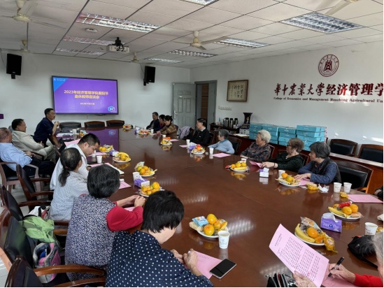 李谷成向各位退休教师介绍了学院近一年来学院在党建、人才培养、科学研究、国际合作与交流、社会服务等方面的事业发展情况。向晋文从背景目标、建设进展、愿景路径三个方面向老教师们介绍了我校襄阳书院的情况。