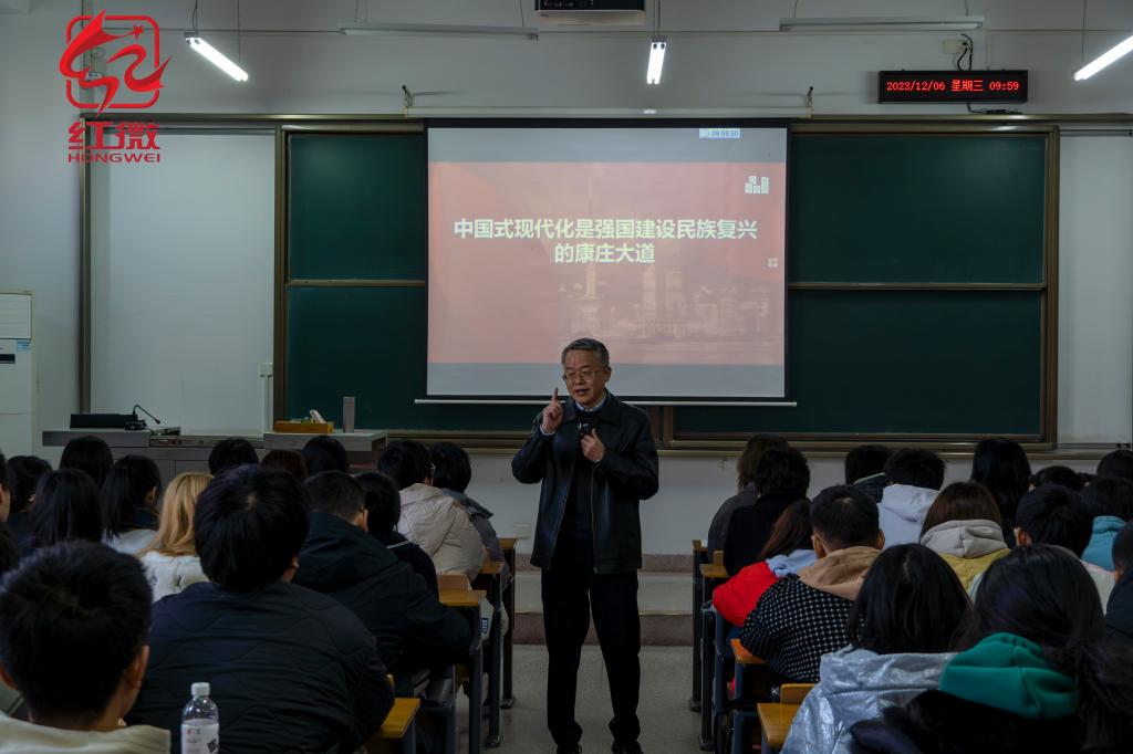12月6日上午,校党委副书记、纪委书记廖济忠在四教c203教室为经济学类2301—2303班讲授了《形势与政策》课程,向同学们生动而又深刻地诠释了“中国式现代化”的内涵和意义。