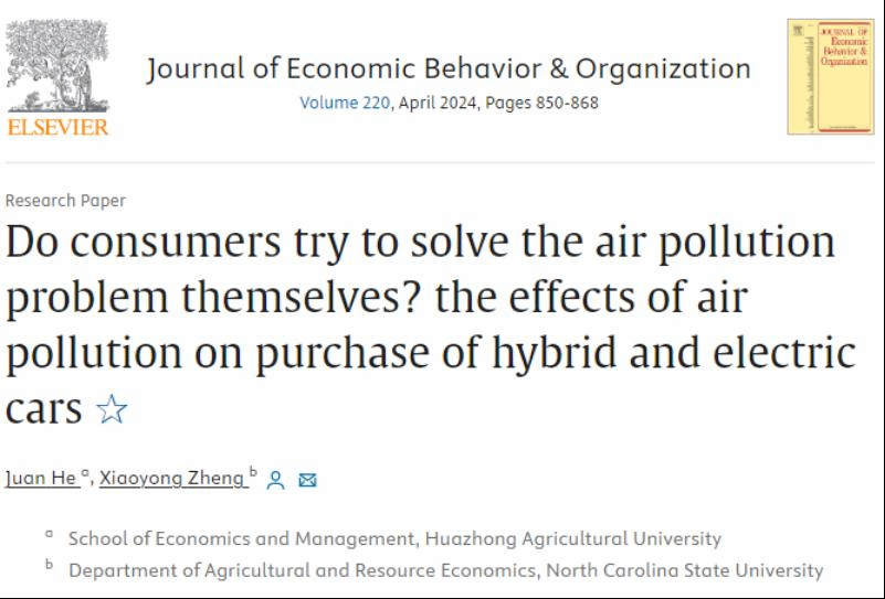 Reference:Juan He, Xiaoyong Zheng (2024). Do Consumers Try to Solve the Air Pollution Problem Themselves? The Effects of Air Pollution on Purchase of Hybrid and Electric Cars. Journal of Economic Behavior & Organization, 220, 850–868.https://doi.org/10.1016/j.jebo.2024.03.00