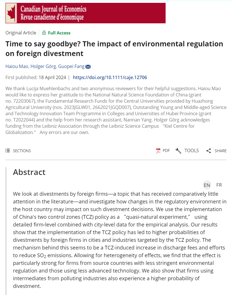 近日,我院毛海欧副教授与德国基尔世界经济研究所Holger Görg教授、华中科技大学经济学院方国培博士在经济学类权威期刊Canadian Journal of Economics发表题为“Time to Say Goodbye? The Impact of Environmental Regulation on Foreign Divestment”的论文。该研究得到国家自然科学基金(72203067)、365英国上市集团自主科技创新基金(2662021JGQD007)、365英国上市公司高水平论文培育项目(2023JGLW01)、湖北省高等学校优秀中青年科技创新团队“农业产业与技术经济”(T2022044)的资助。Canadian Journal of Economics由加拿大经济学会主办,在国际经济学界享有较高声誉和广泛认可度,是国际贸易领域公认的Field Top期刊,这也是学院近年来在国际主流经济学期刊上取得的重要突破。