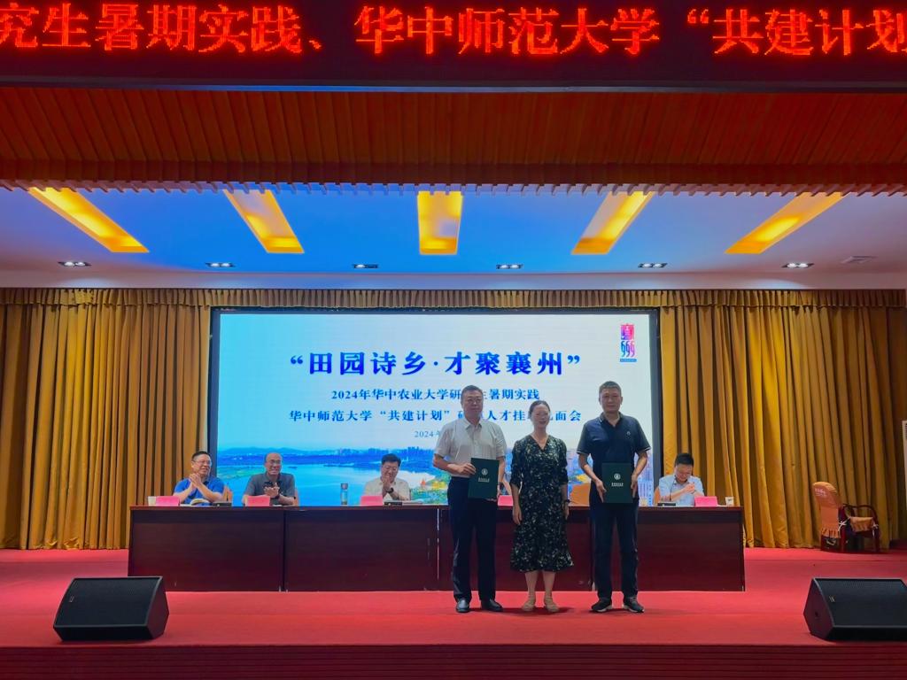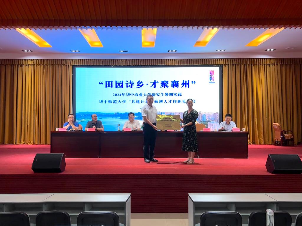 研究生院培养处处长祁婧为襄州区农业农村局授牌研究生联合培养实践基地,为襄州区农业农村局母运振和黄秀斌两位专家颁发行业导师聘书。