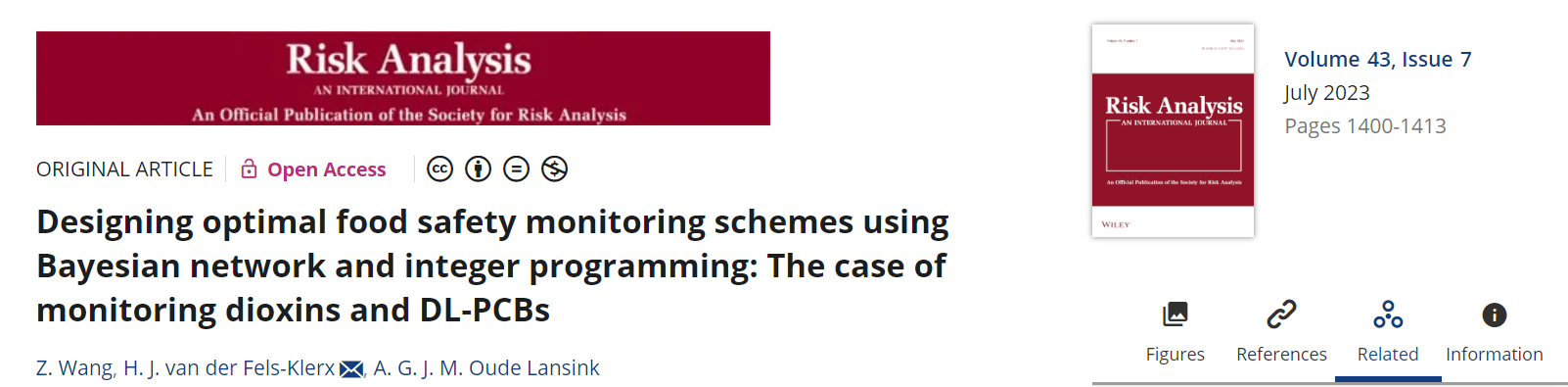 近期,我院王正聪副教授与荷兰瓦赫宁恩大学H. J. van der Fels-Klerx和A. G. J. M. Oude Lansink教授在风险管理领域权威期刊“Risk Analysis”发表了题为 “Designing optimal food safety monitoring schemes using Bayesian network and integer programming: The case of monitoring dioxins and DL-PCBs”( 论文链接:https://doi.org/10.1111/risa.14030)的研究论文。该研究得到365英国上市集团自主科技创新基金(2662022ZKQD003)和荷兰瓦赫宁根食品安全研究中心的资助。