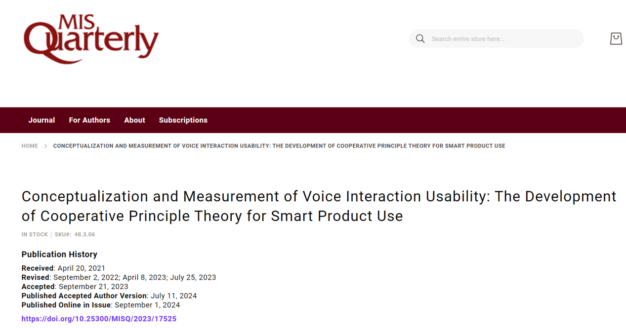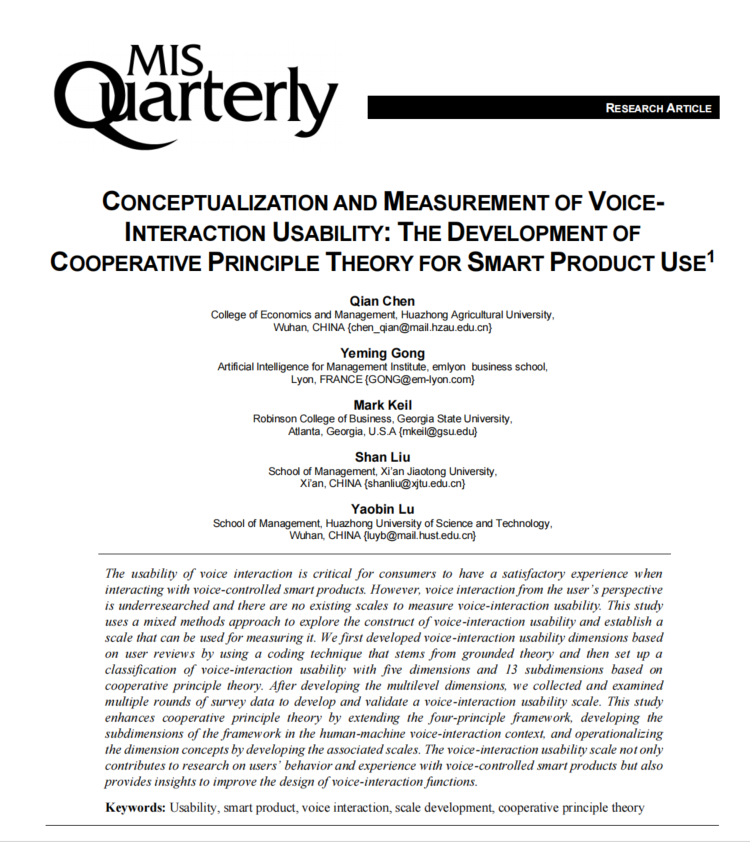 近日,我院陈倩副教授、法国里昂商学院龚业明教授、美国佐治亚州立大学Mark Keil教授、西安交通大学刘汕教授、华中科技大学鲁耀斌教授合作撰写的论文“Conceptualization and measurement of voice-interaction usability: The development of cooperative principle theory for smart product use ” 发表于国际管理学期刊UTD 24期刊MIS Quarterly。该研究受到了国家自然科学基金的资助。