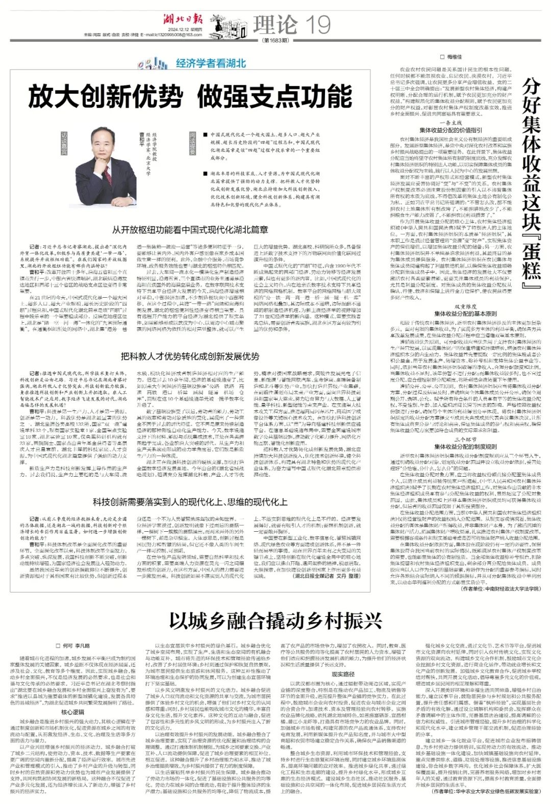随着城市化进程的加速,城乡发展不平衡已成为制约国家整体发展的关键因素。城乡差距不仅体现在经济层面,还涉及社会、文化、教育等多个维度。因此,实现城乡融合,推动乡村全面振兴,不仅是经济发展的必然要求,也是社会和谐与文化传承的必然要求。习近平总书记在湖北考察时指出“湖北要在城乡融合发展和乡村全面振兴上奋发有为”,要求“推进以县城为重要载体的新型城镇化建设,发展各具特色的县域经济”,为湖北促进城乡共同繁荣发展指明了路径。