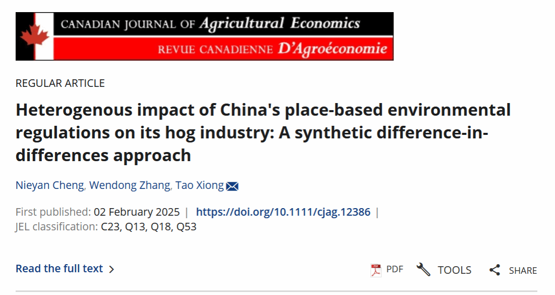 近日,我院熊涛教授与合作者的研究论文 “Heterogenous impact of China’s place‐based environmental regulations on its hog industry: A synthetic difference‐in‐differences approach”在国际农业经济管理领域重要期刊Canadian Journal of Agricultural Economics发表。该研究运用新颖的合成双重差分法,研究旨在保护南方水网地区水质的生猪产业环境规制的政策效应,为明晰环境规制政策的异质性效应提供了实证依据。