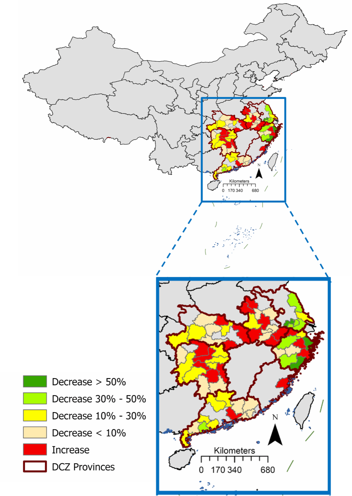 因此,本文在省级和地级市层面应用SDID探究生猪养殖约束发展区政策对生猪养殖和水质的异质性影响。研究结果表明,整体上,该政策导致了约束发展区省份的生猪存栏量出现显著下降,这主要归因于现有养猪场的关闭,而非现有养猪场的搬迁。生猪存栏量的下降程度在不同省份和地级市差异较大(地级市层面的SDID估计结果如下图所示),平均处理效应从增加2%到减少40%,约束发展区省份的生猪产业损失超过50.6亿美元。进一步地,论文从位于大城市上游的县、生猪调出大县和靠近水源地的县等三方面解释异质性政策效应的来源。