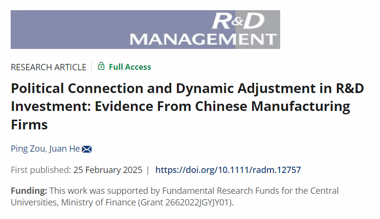 我院会计系邹萍副教授和经济学系贺娟副教授近期在“R&D Management”合作发表论文“Political Connection and Dynamic Adjustment in R&D Investment: Evidence From Chinese Manufacturing Firms”。“R&D Management”属于JCR社科类一区SSCI期刊,五年影响因子7.1,ABS 3星期刊。该研究受到我院自主科技创新基金(项目号:2662022JGYJY01)资助。邹萍为第一作者,贺娟为通讯作者。