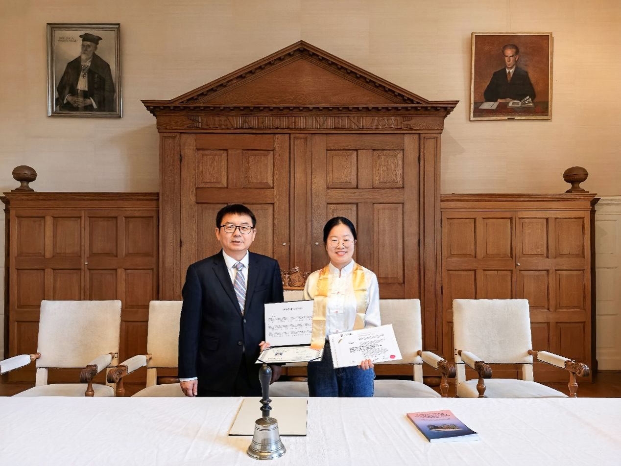 签署协议签前,严建兵校长为我院首位获得双博士学位的李腾同学颁发了我校博士学位证书。李腾已于2024年12月通过格罗宁根大学博士论文答辩并取得博士学位,2025年6月完成我校博士学位登记并取得博士学位。