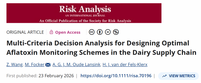 近日,粮食安全数智治理实验室王正聪副教授团队在“Risk Analysis”期刊(ABS 4星,JCR-Q1,中国管理科学学会A级,国际风险协会官方旗舰期刊)发表最新研究成果 “Multi-Criteria Decision Analysis for Designing Optimal Aflatoxin Monitoring Schemes in the Dairy Supply Chain”。该研究致力于解决乳制品供应链中黄曲霉毒素的监测难题,即饲料中的黄曲霉毒素B1 会通过代谢转化为牛奶中的黄曲霉毒素M1,既有害公众健康,也会带来产业损失。研究团队引入多准则决策分析,把不同监测方案在“健康保护、成本、社会福利与可实施性”等多项指标上进行综合评估,并分别纳入饲料行业、乳品行业的专家意见及全供应链视角的偏好权重,最终结合优化算法为如何在供应链配置监测强度提供最优决策依据,并说明让不同利益相关方共同参与,是制定既科学可靠又更容易被接受的食品安全监测策略的关键。该研究受到国家自然科学基金项目(No. 72403094)和瓦赫宁根国际合作项目(Wageningen University and Research)的资助。(文章地址:https://onlinelibrary.wiley.com/doi/10.1111/risa.70196?af=R)