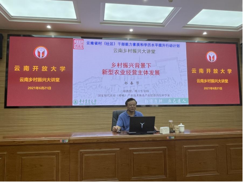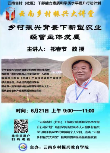 为提促进云南省村干部的能力素质和学历水平“双提升”,培养村干部的专业技能水平和解决实际问题的能力,2021年6月21日上午,我院经济学系祁春节教授受邀前往昆明市在云南开放大学做客云南乡村振兴大讲堂,进行了题为《乡村振兴背景下新型农业经营主体发展》的专题讲座。云南省129个县级行政区的村(社区干部)共计15000多人参加了本次线上培训。