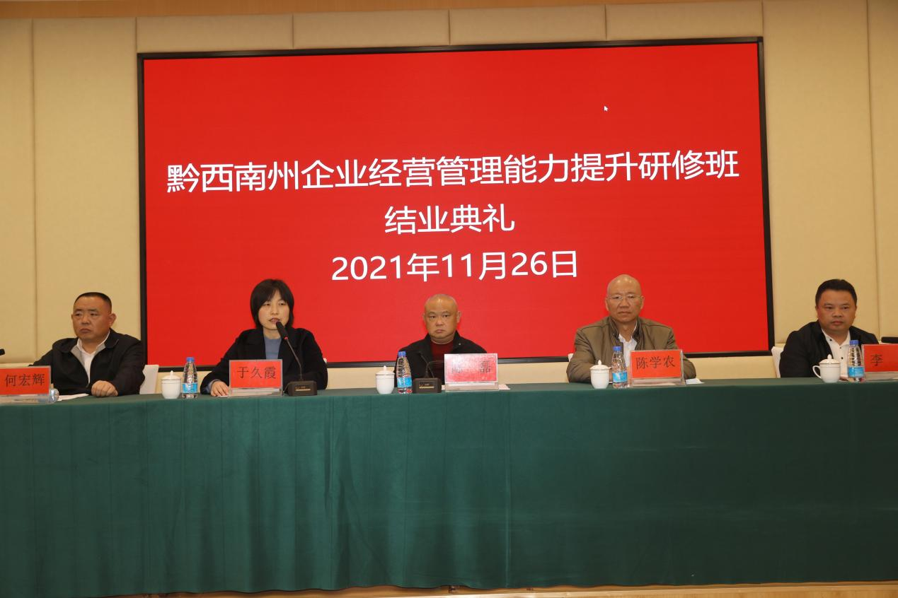 11月26日,由我院和贵州中信大数据联合承办的黔西南州企业经营管理能力提升研修班经过一年的研修学习结业。黔西南州国资委党委书记、主任陈磊同志、州国资委一级调研员陈学农、州国资委党委委员、副主任何宏辉同志、学院副院长于久霞出席结业典礼。