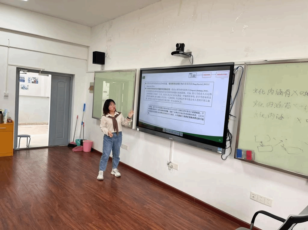 4位分享者包括魏昀萱、李金妹、高聪等三位来自不同团队的研究生和陈通老师,他们就研究的最新课题进行了分享,涉及了临期食品的销售策略、网购APP的序贯捆绑推介行为、地理标志农产品的消费行为以及AI在游戏消费行为作用机制等市场营销前沿话题。针对各自的报告内容,老师与同学们进行了充分的讨论与交流,从选题、理论以及方法上交换了建设性意见。