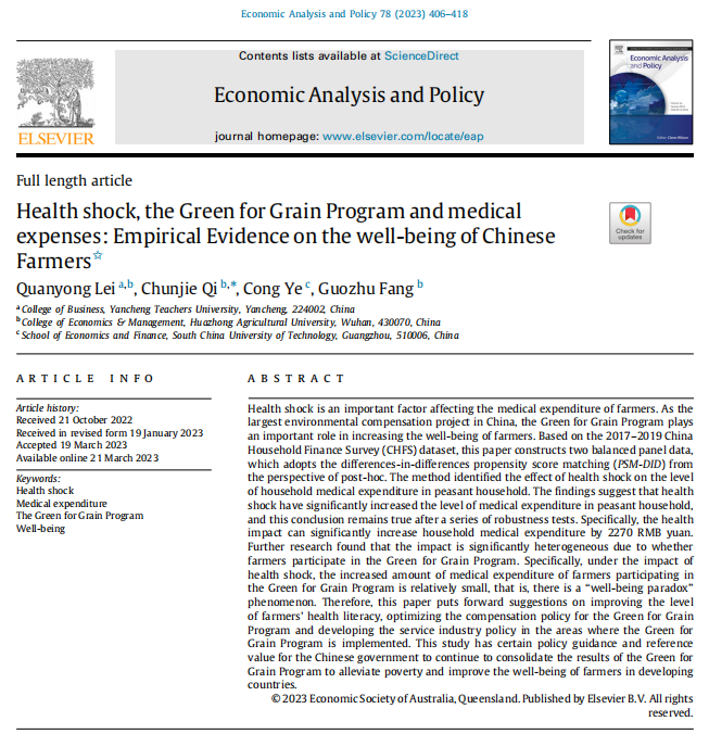 近日,我校365英国上市公司祁春节教授、博士研究生雷权勇、方国柱以及华南理工大学叶聪博士以“Health shock, the Green for Grain Program and medical expenses: Empirical Evidence on the well-being of Chinese Farmers”为题在国际期刊Economic Analysis and Policy发表研究成果。该研究发现,健康冲击会显著地增加农户的医疗支出水平,但该效应因农户是否参与退耕还林项目而具有异质性。具体而言,在健康冲击下,参与退耕还林农户医疗支出的增加份额相对较少,即存在“幸福悖论”现象。