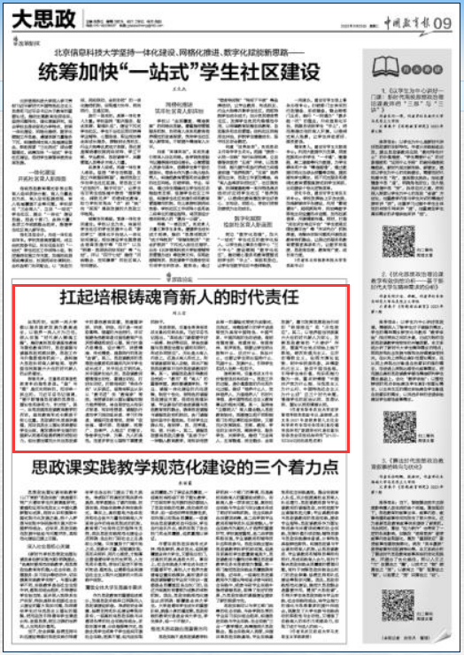 (刘三宝)纵观历史,世界一流大学都以服务国家发展为最高追求,以培养一流人才为己任。深入实施“时代新人铸魂工程”,推动高校思政课显性教育与隐性教育并行,思政课程与课程思政同频共振,思政工作与价值塑造有机统一,是构建大思政协同育人新格局、培养担当民族复兴大任的时代新人的必然要求。