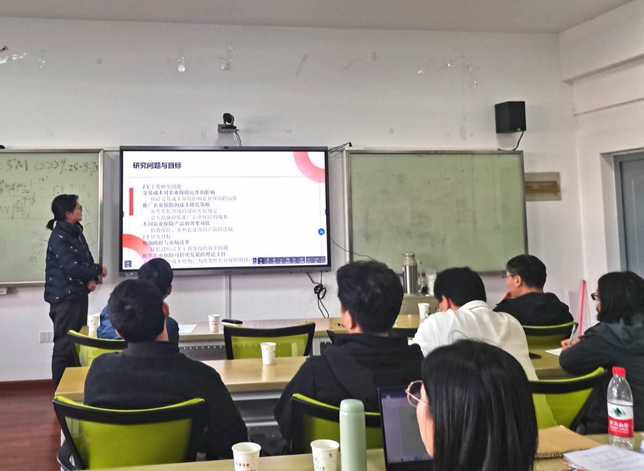 在经济类基金项目中,何欣悦围绕“农产品期货市场尾部风险测度”进行了汇报,从立项依据、研究内容、现阶段研究进展及预期成果等方面进行了阐述,李晓云为大家阐述了粮食生产系统韧性的概念,并从选题思路、研究目标与意义、国内外研究进展、研究方法等,从数据和研究视角等方面与评委老师进行探讨。祁春节聚焦“农产品有效供给保障能力”进行了项目汇报,贺娟阐述了从“交易成本”视角研究农业保险相关问题,曾光则从“资源禀赋”和“集聚外部性”两个视角研究我国县域农产品加工业集群的演化机制,评委老师针对选题意义、具体研究内容进行了点评,并给出指导建议。何可从“减污降碳”视角测算种养结合循环农业的生态经济效率,郑宏运聚焦“互联网使用”,研究农村居民的食物消费决策及营养摄入问题。评委老师针对汇报内容,从研究意义、研究方法、注意事项等方面进行了评价与指导。