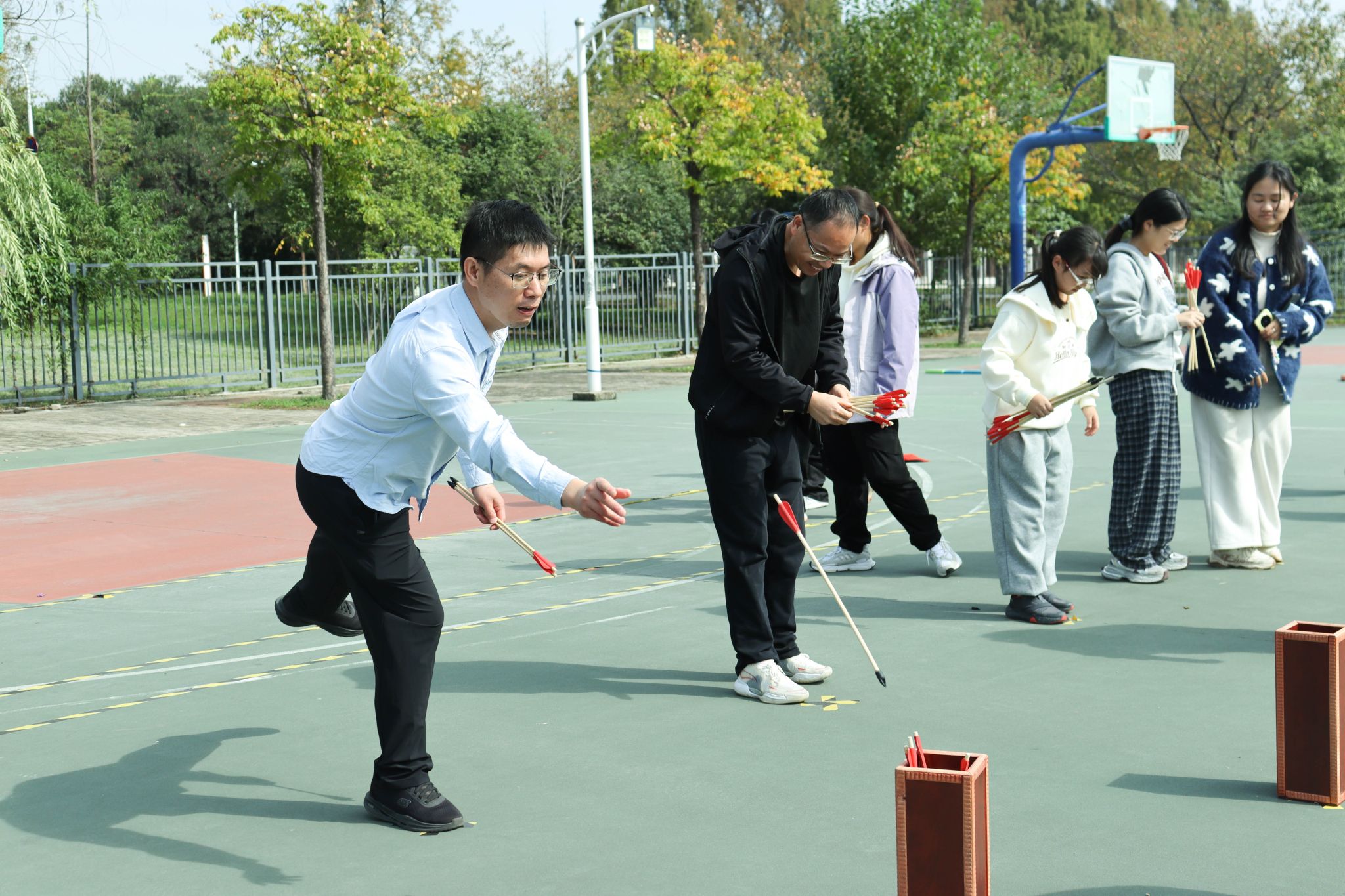 “跃动壶影”游戏藏着古今融合的巧思——参与者需先完成立定跳远(男生2米、女生1.5米),达标后才能获得10次投壶资格。这份“先体能后巧技”的独特设计,一下子吸引了大批师生驻足,人人都跃跃欲试。