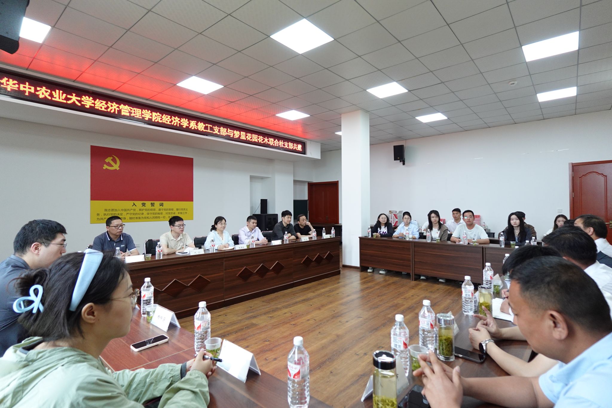 在梦里花园创客中心,经济学系师生党支部与梦里花园花木联合社党支部开展联学共建,围绕“党建引领与乡村振兴”展开深度交流。花木联合社秘书长、华农09级校友沈腾分享了他的创业历程:从资源整合到产业链打造,始终坚持“跟党创业”,依托母校智力支持,解决地方实际问题。他与孝昌县联合推动农业产业化,创建孝昌梦里花园花木专业合作社,通过整合“土地、农户、市场”等资源,带动178家农业企业发展,年产值高达5亿元。经济学系教授熊航结合自身调研成果,强调高校需“走出课堂”,通过产学融合、师生联动服务地方发展。学生党员代表王浩东和姚可漪表示,希望能够扎根基层,将专业知识与乡村振兴实践结合,推动农业从“靠天吃饭”转向“靠智发展”。