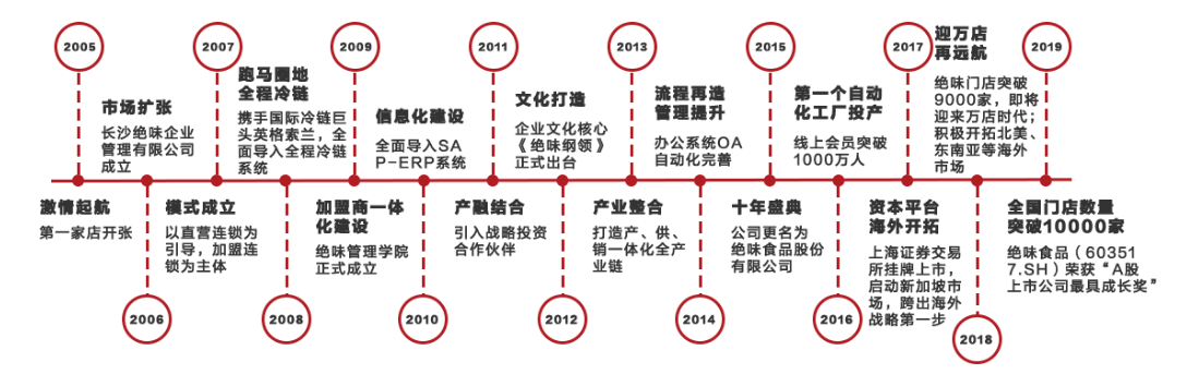 绝味食品股份有限公司(以下简称“公司”)成立于2005年4月15日,公司业务覆盖全国30个省级市场,初步覆盖香港地区以及新加坡、加拿大等海外市场,并建立起全面覆盖长江流域、珠江流域、黄河流域、松花江流域的20多个大型食品加工生产基地,门店总数超过10000家,员工超4000人,销售规模超过40亿元。2017年3月17日,在上海证券交易所上市(股票代码:603517) 。