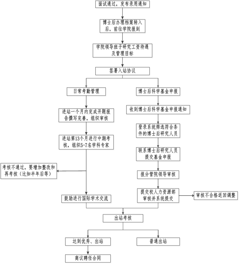 博士后面试开题、中期考核出站、日常考勤年度考核、基金申报工作流程图